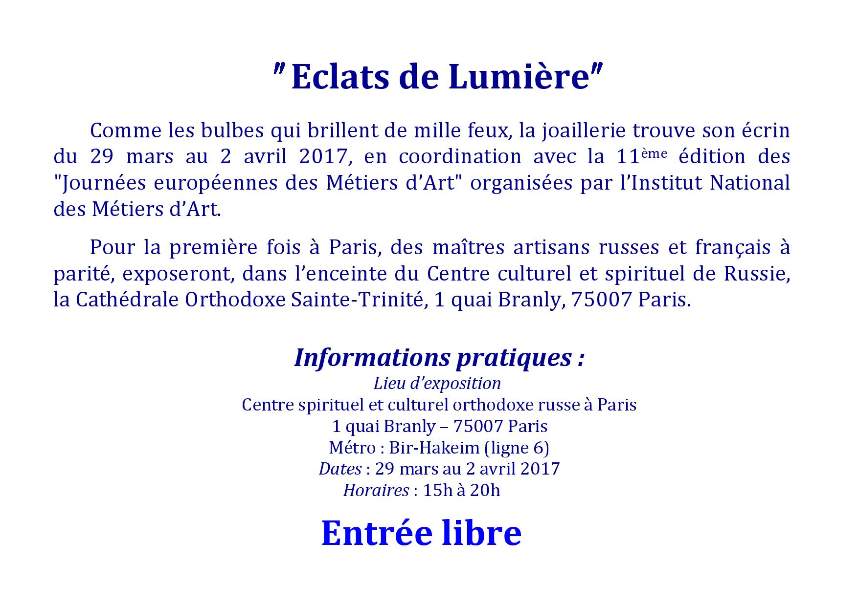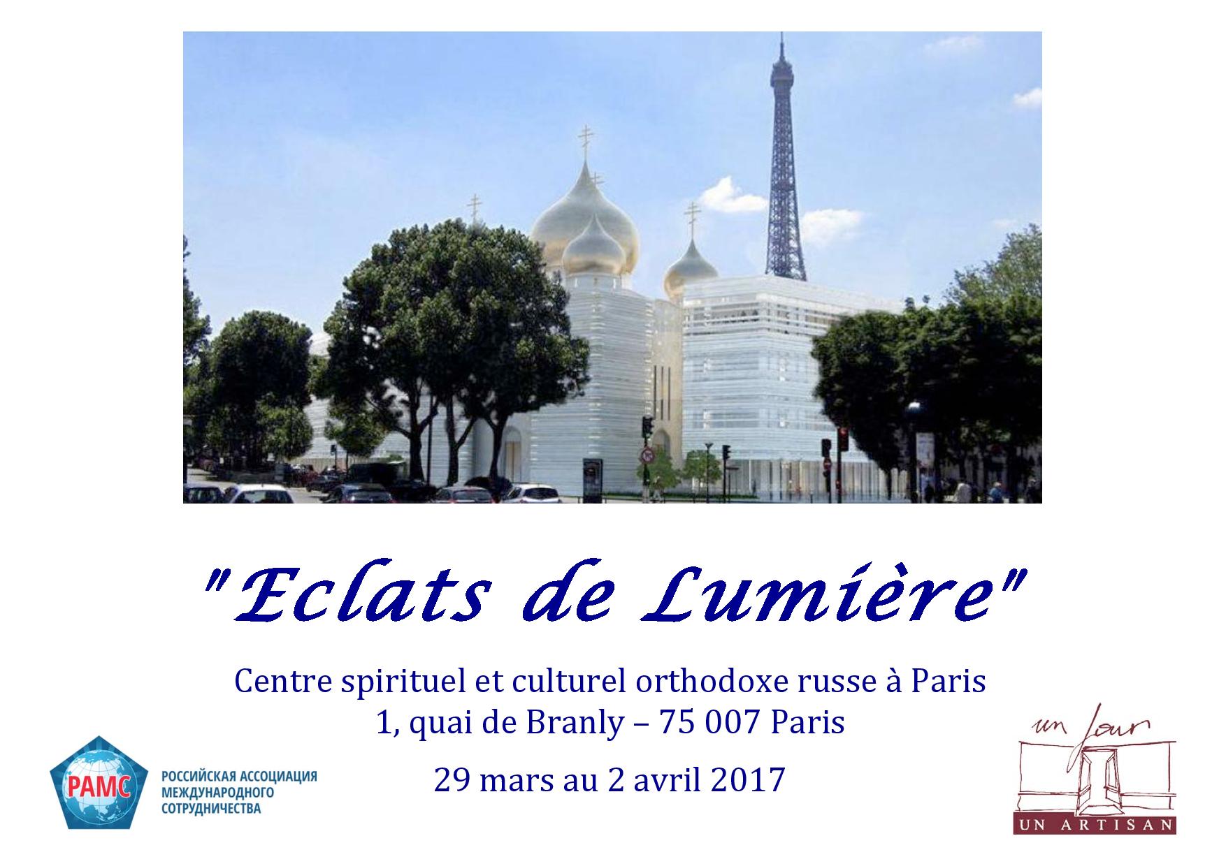 3月29日开始 在巴黎,俄罗斯教精神和文化中心 CSCOR 有 “Eclats de Lumière”展览和音乐会活动。巴黎的俄罗斯教精神和文化中心 是俄罗斯政府花费1.7亿欧元在俄罗斯外,几十年来,第一次建立的【精神与文化中心】。于2016年10月19日揭幕